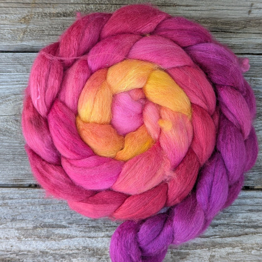 Our Haunui wool combed top is sourced from a single family farm in New Zealand and hand dyed by Kristin in Idaho. Haunui wool has a stunning handle. It is the best of both worlds--soft enough to be used for next-to-skin clothing with a long staple for an indulgent spinning experience for both beginning and advanced spinners. This line is blended with 30% Grade A+ Mulberry Silk for ultimate luxury.